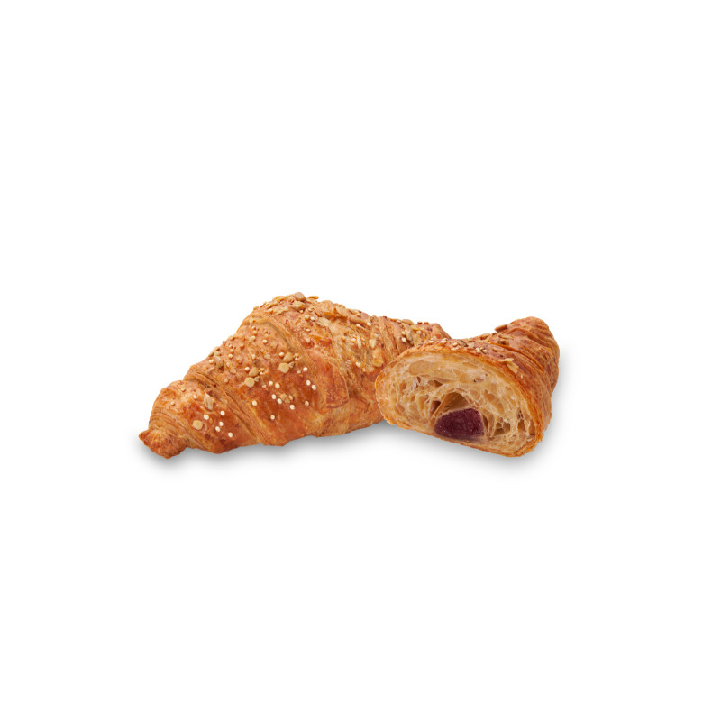 A buttery croissant filled with a vibrant mix of red fruit compote. Crisp outside, juicy and fruity inside. A refreshing pastry for morning or afternoon indulgence.