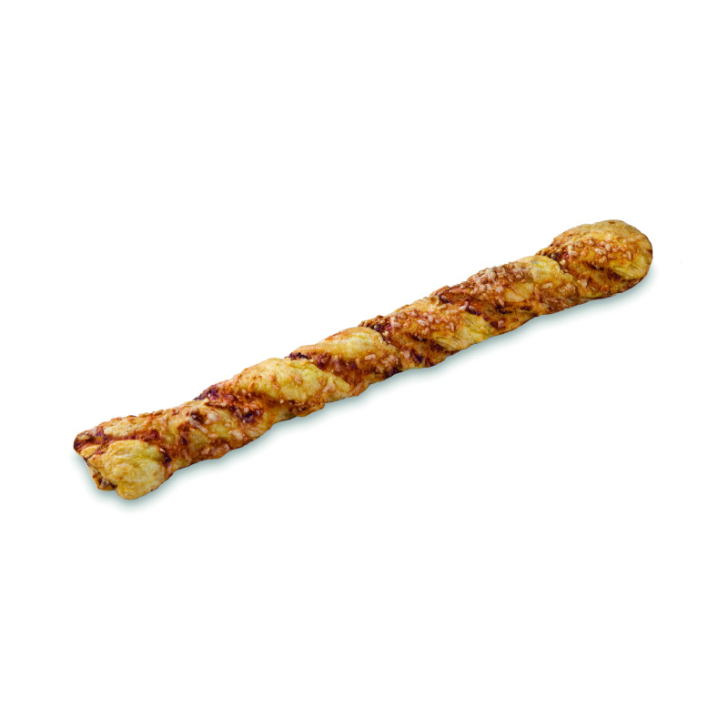 A puff pastry or breadstick baked with cheese (mozzarella or cheddar); crisp, cheesy texture. Commonly served as a snack or appetizer. عجينة منتفخة أو عصا خبز مخبوزة بالجبن (موزاريلا أو شيدر)؛ قوام مقرمش وجبني. تُقدّم عادة كوجبة خفيفة أو مقبلات.