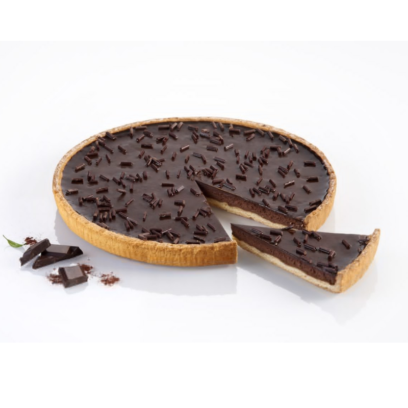 Smooth chocolate crème pâtissière, topped with a dark chocolate glaze and decorated with plain chocolate sticks. Intense recipe made with chocolate 70% cocoa. Pure butter shortcrust.