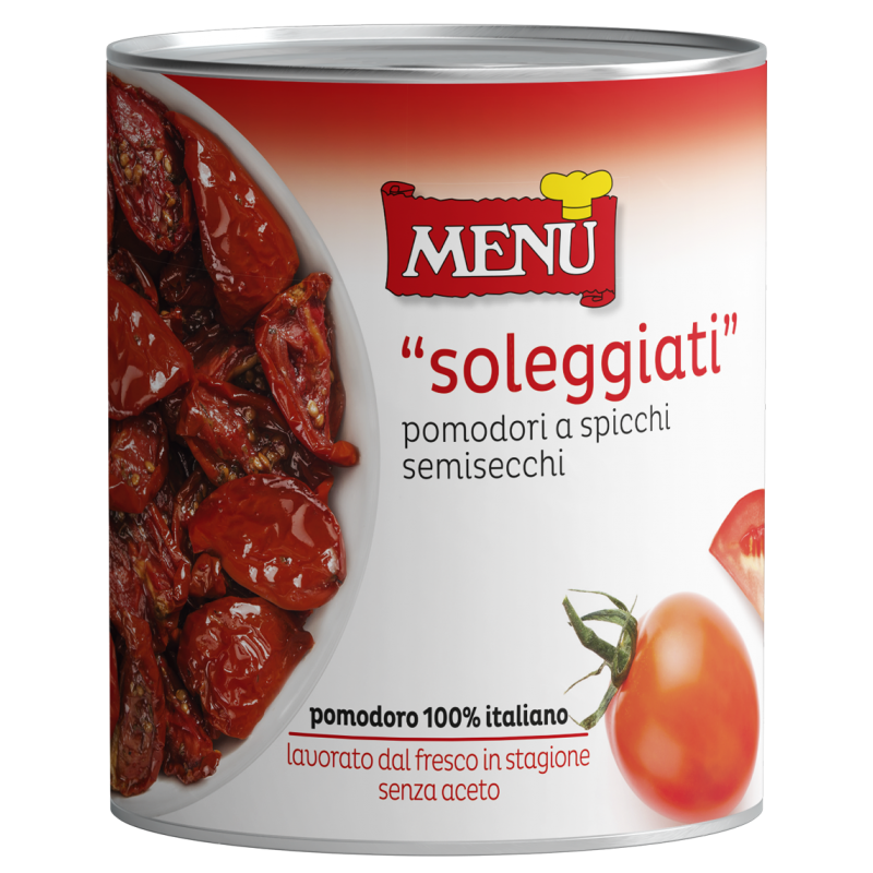 Round tomatoes cut into wedges, salted, slightly dried, and prepared with extra virgin olive oil, oregano, and garlic, without any vinegar. With their sweet and delicate taste, they are ideal for stuffing pizzas, sandwiches, and bruschetta.