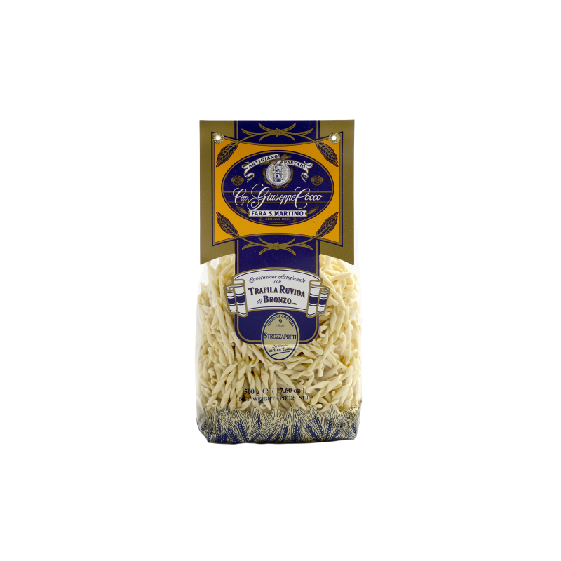 In Italian, Strazzapreti is known as priest choker or priest strangler. The gorgeous pasta can be described as an elongated form of cavatelli or hand-rolled pasta typical of the Umbria region of Italy.