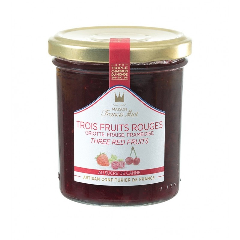 This cane sugar fruit preserve received a Gold Medal in the Concours Général Agricole in 2015, at the Salon de lAgriculture. This recipe consists of three red fruits and is a balanced blend of strawberry, raspberry and sour cherry. Made with care, these fruits perfectly blend together to unveil the sweet flavors of our gardens and forests.
