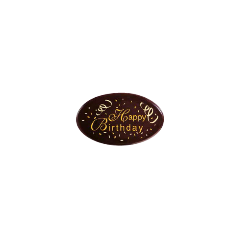 PCB Creation's Oval Dark Chocolate "Happy Birthday" pieces are made from fine dark chocolate, perfect for celebrating birthdays with a gourmet touch. These elegant ovals add a rich chocolate flavor and a decorative element to cakes, pastries, and desserts.