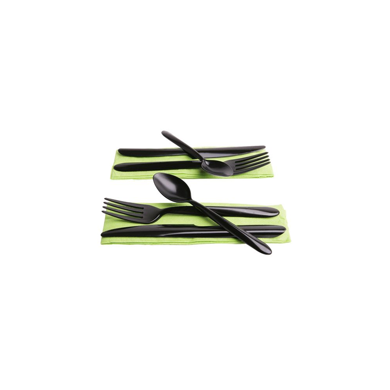 Composed of a knife, a fork, a small spoon and a napkin, this all-in-one cutlery kit signed Philippe Starck offers a practical solution for meal tray, take-out, snacking services