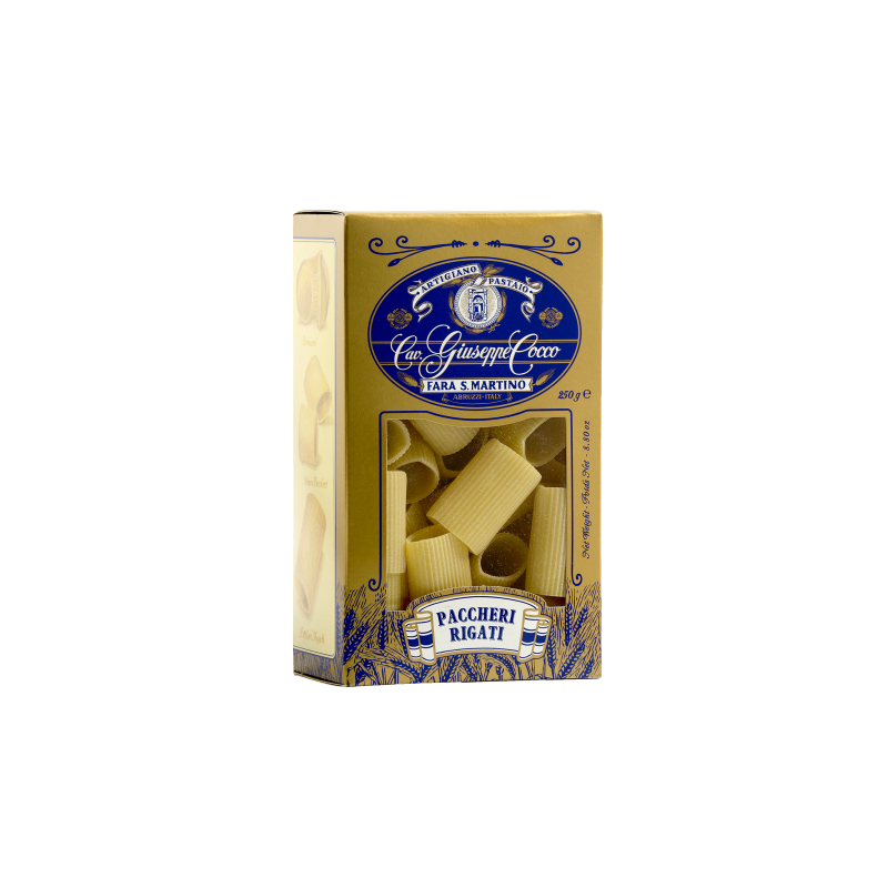 A typical pasta from Campania is Paccheri Rigati. The name derives from "paccarià" which means "slap" in Neapolitan dialect. It is an excellent choice for cooking pasta dishes with rich, hearty meat ragùs such as the Neapolitan ragù, which helps to fill your pasta with flavor.