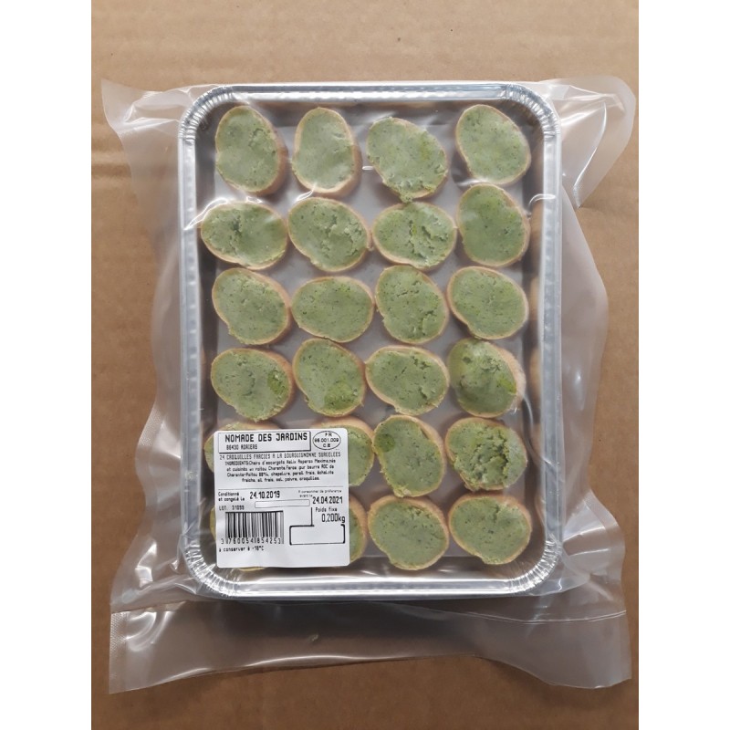 Escargots born, farmed and cooked in France. In each biscuit : one escargots flesh cooked in a cour-bouillon and stuffing with AOC butter, garlic and parsley